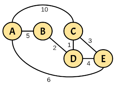 dijkstra_spt('A', {'A': {('B', 5), ('C', 10), ('E', 6)}, 'B': {('A', 5), ('D', 2)}, 'C': {('A', 10), ('D', 1), ('E', 3)}, 'D': {('B', 2), ('C', 1), ('E', 4)}, 'E': {('A', 6), ('C', 3), ('D', 4)}, })