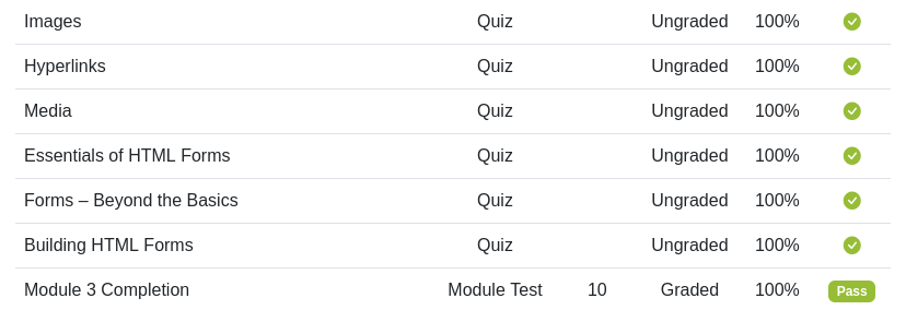 Una vez que hayas concluido el punto anterior, ve al Dashboard, da clic en donde dice Gradebook y verifica que todos los quizzes aparezcan palomeados en verde y que el Module 3 Completion esté con la leyenda “Pass”.